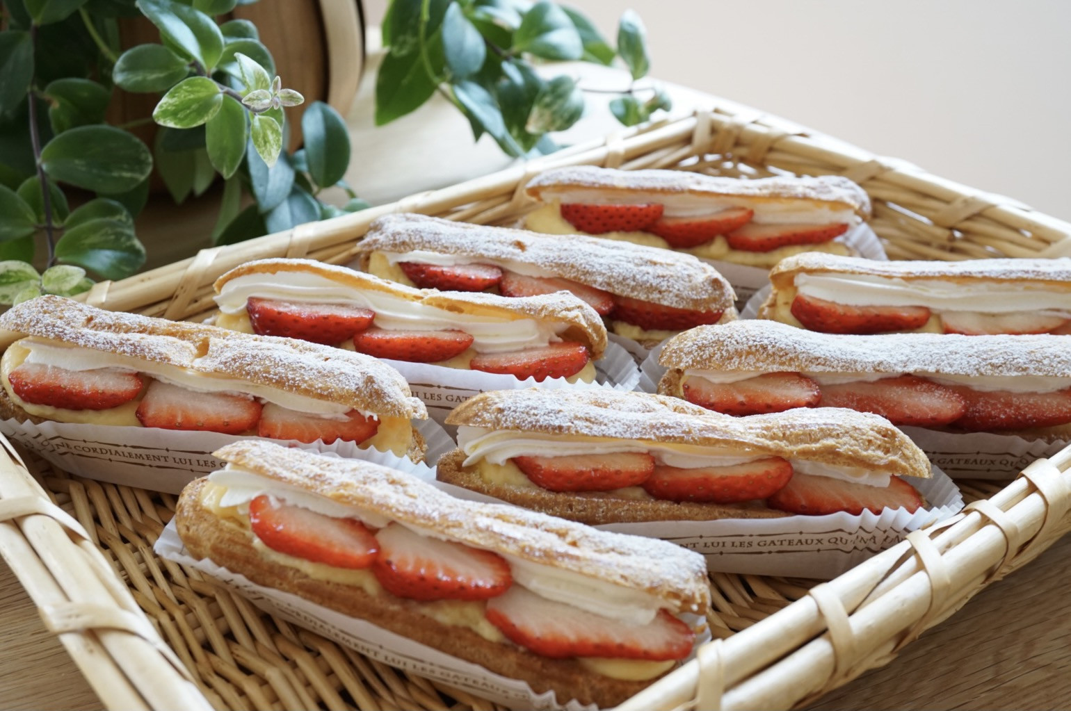 本日ご用意しているべべのエクレールはカスタードクリームと生クリームで苺を挟んだ2種類の甘味と苺の酸味を味わえる一品です。