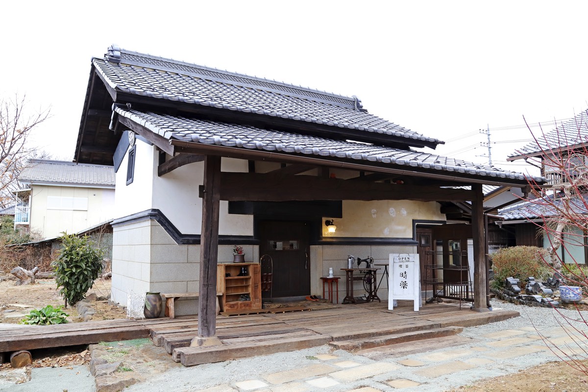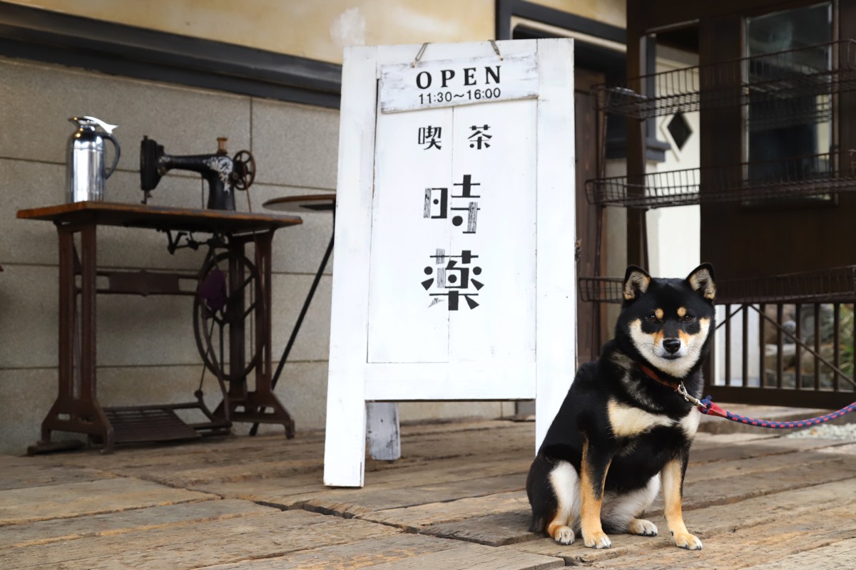 高根町の静かな町中に佇み、看板犬のはなちゃんがお出迎えする喫茶 時薬。築100年を超える蔵を当時の趣そのままに改装。