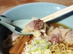 鹿骨で出汁をとったスペシャルスープに、鹿肉がギュウギュウに詰まった肉厚ワンタンを浮かべ、細ちぢれ麺が何とも上品な味わい。