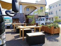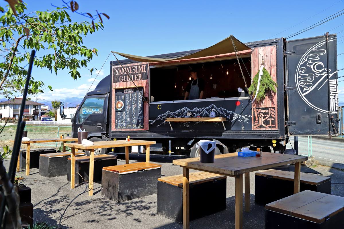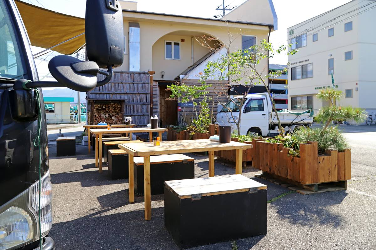 Yamatsumi Gibier 駐車場にテーブルと椅子を出し、とっておきのジビエラーメンを堪能できる。