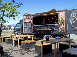 スタイリッシュな黒い大型キッチンカー「山祇ジビエ」が営むラーメン屋さん。