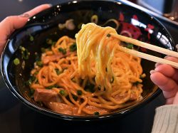 汁気のないラーメンのような油そばはカロリーも塩分も低く、ヘルシー!