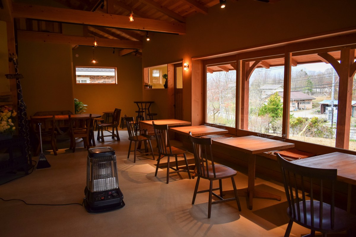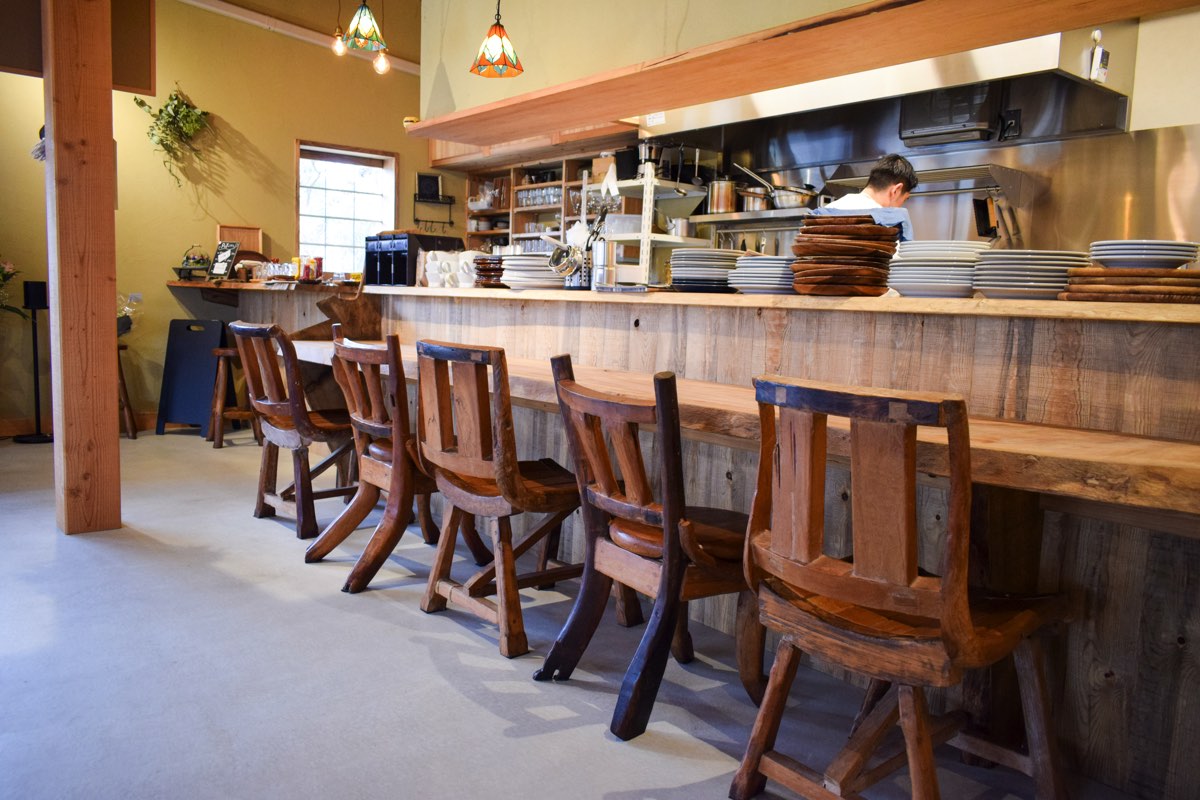 木のごつごつ感を活かしつつ洗練された店内に広がる大きな窓からは、暖かな光が差し込む。