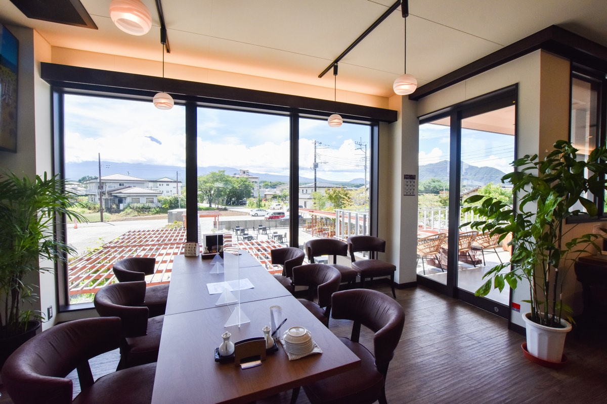 三七の広場2階のワイン・ヤムチャカフェ。店内は富士山を望めるテーブル席のほか個室もあるので、のんびり過ごせるのが嬉しい。