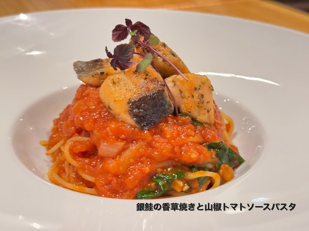新作パスタは「銀鮭の香草焼きと山椒トマトソースパスタ」