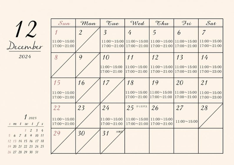 12月の定休日・営業時間のお知らせです。