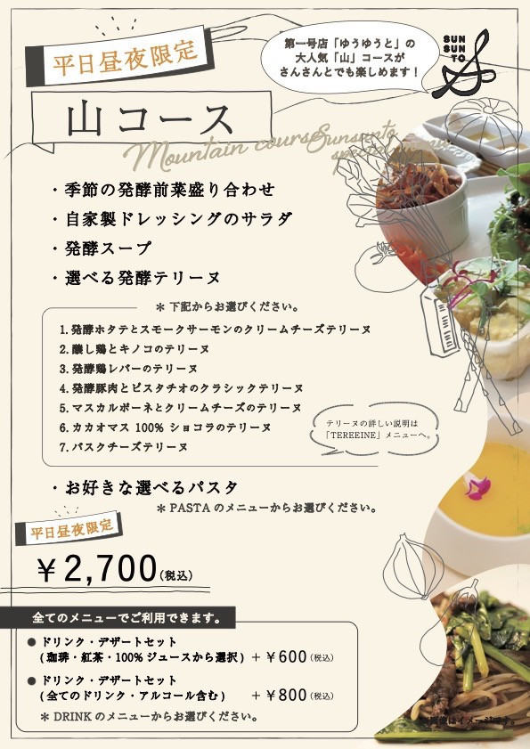 1号店醸しカフェゆうゆうとの大人気メニュー【山コース】をさんさんとでも、今日から、平日昼夜限定で召し上がれます。