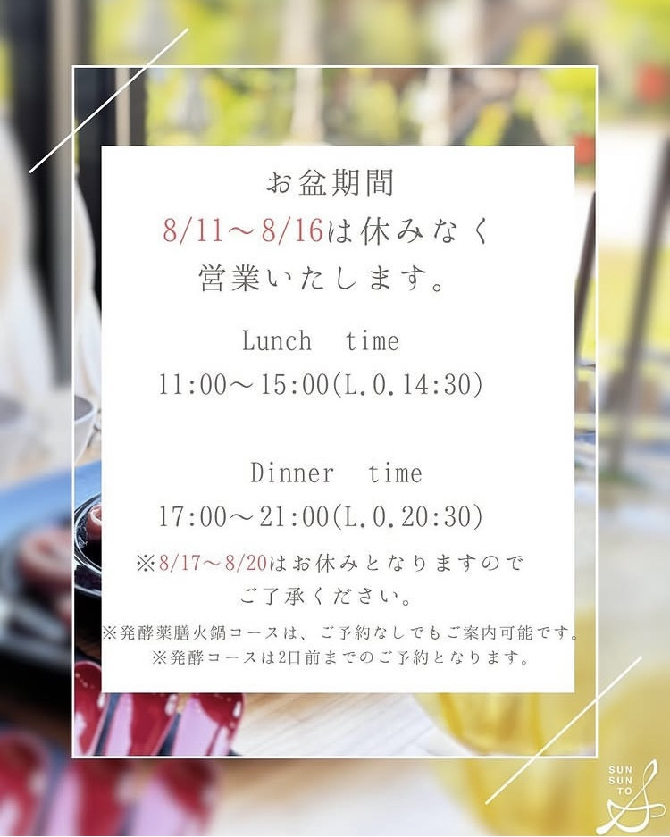 いつも醸し薬膳さんさんとをご利用いただきありがとうございます🌻 下記、来週の営業日・来店空き状況となります。 11日(月)〜16日(土)は、お盆期間中のため、休みなく営業とさせて...