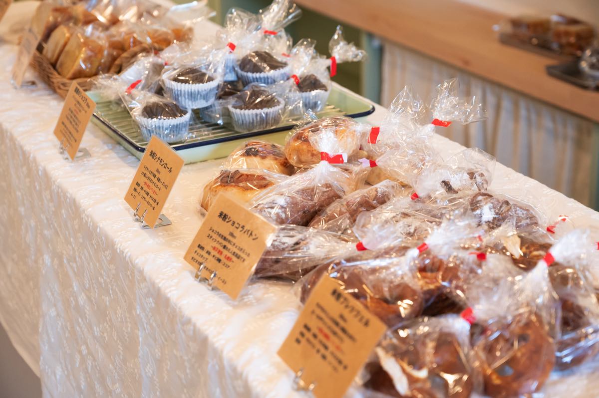 心を込めて丁寧に手づくりした米粉パンや米粉のお菓子が常時10種類ほど、週替わりで並ぶ。