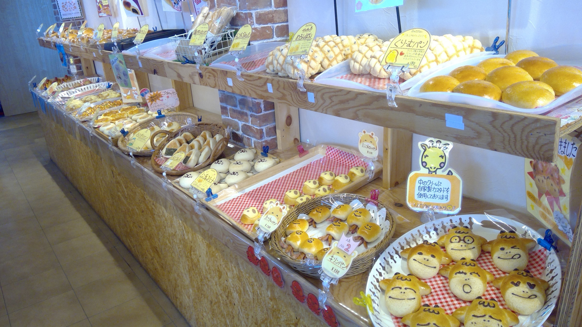 お子様が喜ぶ『キリンパン』や『ミニメロンパン』一番人気の『ゴロゴロ牛肉と野菜の揚げカレーパン』『大豆キーマの焼きカレーパン』7種類の『クロワッサン』7種類の『フランスパン』など50種類以上のパンをご用意しております。