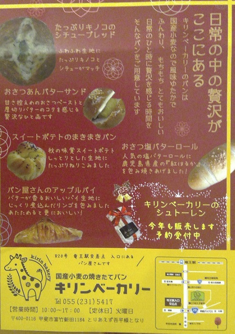 国産小麦の焼きたてパン『キリンベーカリー 甲斐竜王店』 は国産小麦100%の無添加生地でパンを作っています。国産小麦100%の無添加生地でパン作るパンはふわふわでモチモチで、小麦本来の香りや味をお楽... -