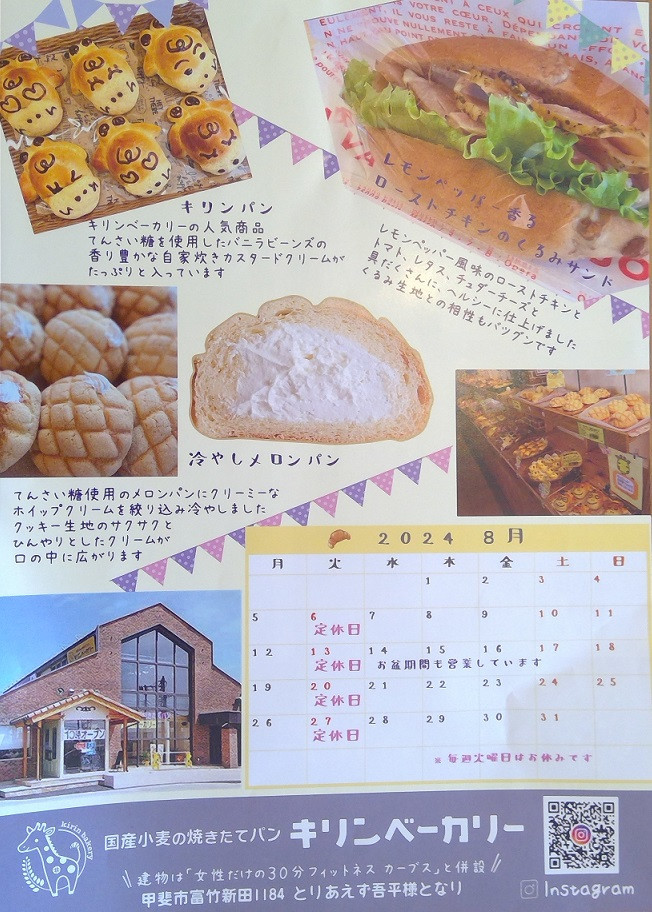 国産小麦の焼きたてパン『キリンベーカリー 甲斐竜王店』は国産小麦100%の無添加生地でパンを作っています。国産小麦100%の無添加生地でパン作るパンはふわふわでモチモチで、小麦本来の香りや味をお楽しみください。