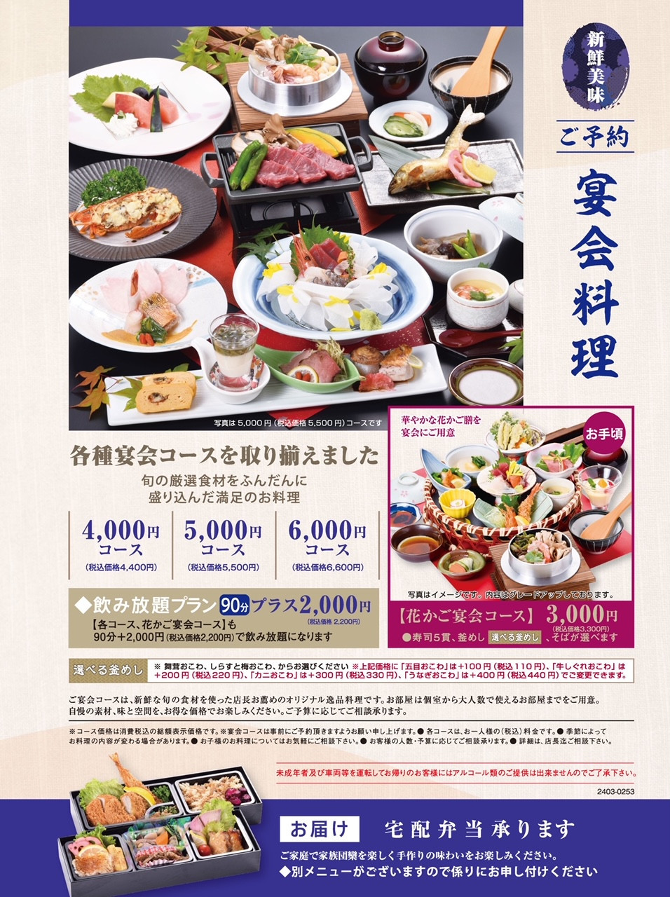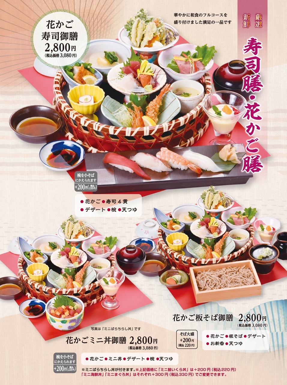 ●花かご寿司御膳 花かご 寿司4貫 デザート 椀 天つゆ ●花かごミニ丼御膳 花かご ミニ丼デザート 椀 天つゆ ●花かご板そば御膳 花かご 板そば デザート お...