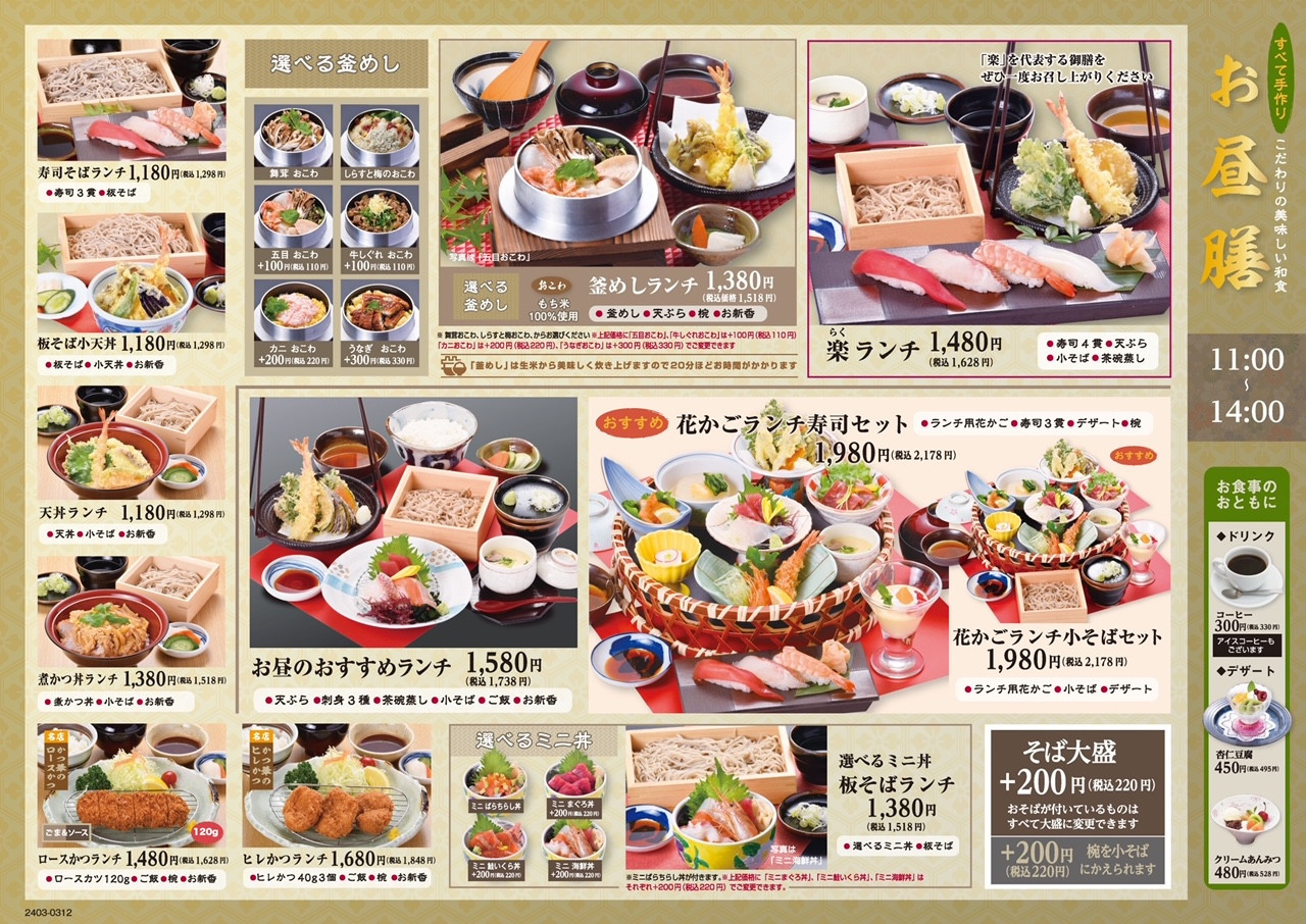 ・花かご寿司御膳 3,520円 ・楽御膳 2,068円 ・選べるお楽しみ御膳 1,958円 ・おこわ釜めし天ぷら刺身御膳 2,618円 ・炙り牛ステーキ御膳 2,618円~ ※全て税込 |