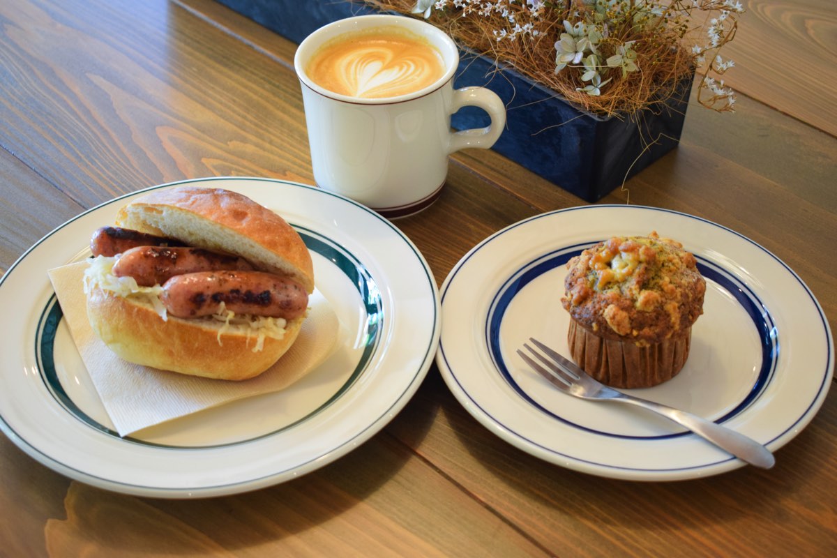 コーヒーのお供にはジューシーな生ソーセージがたまらないホットドッグやサクサクふわふわのマフィンを。