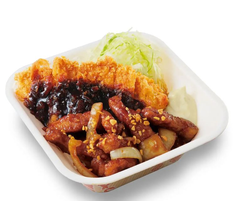 濃厚なニンニク醤油のソースが絡むスティック状にカットした豚ロース肉は、食べやすさだけでなく、食べごたえも忘れません。合い盛りにしたチキンカツで、ボリューム感はもちろん、コクがありクリーミーなマヨネーズを添えた味の変化も楽しめる一品です。