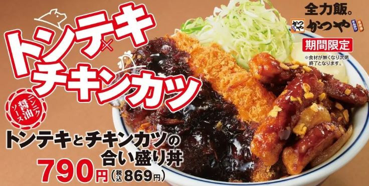 新年度や新生活を迎えるこの時期に、とんかつ専門店「かつや」に行けば「がっつり」が叶う期間限定メニュー「トンテキとチキンカツの合い盛り」を2024年4月5日(金)より販売を開始いたします。
