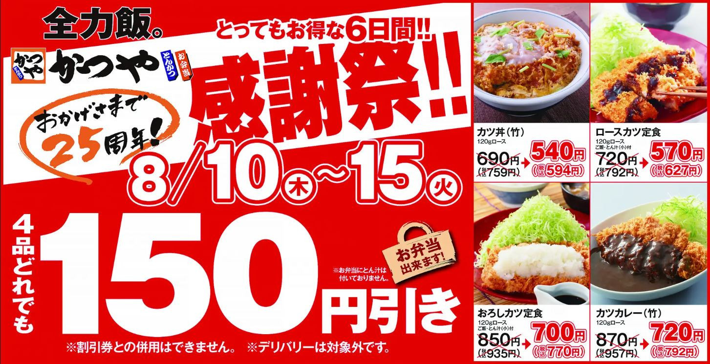 日頃より「かつや」を応援してくださる皆さまへ感謝の気持ちを込めて、2023年8月10日(木)~15日(火)の6日間限定でとってもお得な「感謝祭」を開催いたします。 定番の「カツ丼(竹)」、サクサクや...