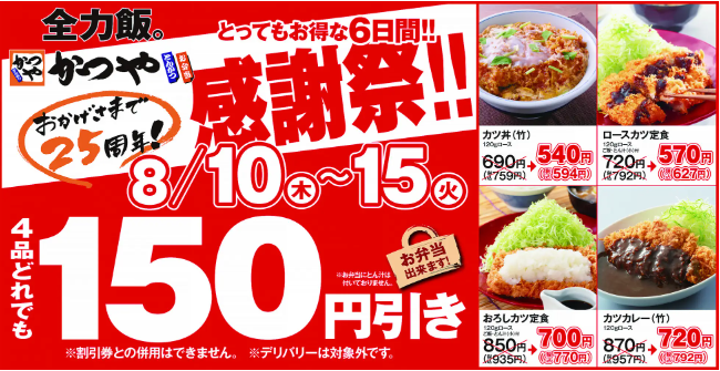 日頃より「かつや」を応援してくださる皆さまへ感謝の気持ちを込めて、2023年8月10日(木)~15日(火)の6日間限定でとってもお得な「感謝祭」を開催いたします。