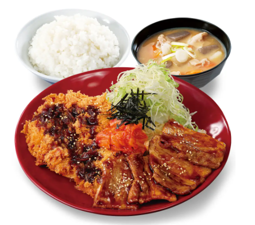 ファンに愛される「合い盛りシリーズ」の新作「豚カルビ焼肉とチキンカツの合い盛り」を期間限定で販売! ボリューム満点なチキンカツと、ごま油がふわっと香る甘辛タレで焼き上げた厚切り豚カルビを合い盛りにし...