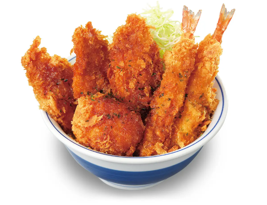 鶏ささみフライが3つ、エビフライが2本と、半熟卵フライが加わったまさにがっつり丼飯。