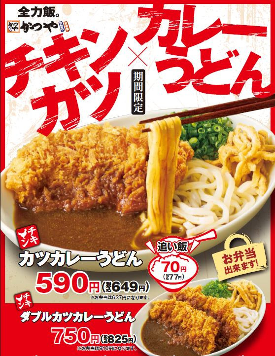 3/5(金)~3/18(木) チキンカツカレーうどんフェア 今回はご飯無しの「チキンカツカレーうどん」 「かつやカレー」とめんつゆで割った和風カレー仕立て♪ チキンはシングルとダブルをご... -