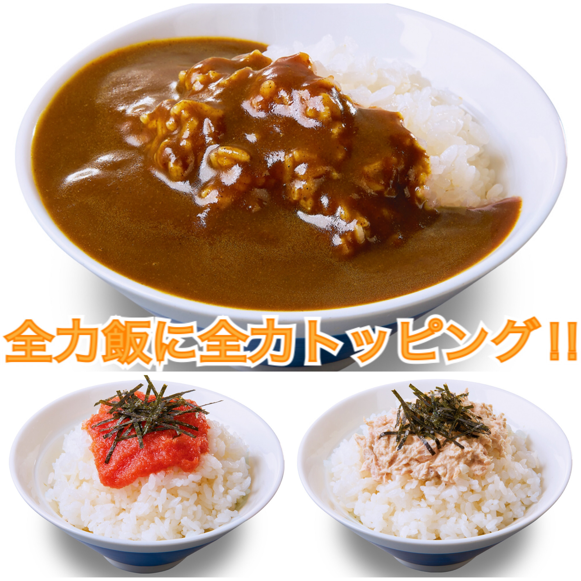 3/19(金)~全力飯に新たなトッピング誕生◎ なんと!100円以下で白飯にウレシイトッピングが可能♪ イートイン99円・テイクアウト共に全て97円!(税込) イートイン 全力飯 めんた... -