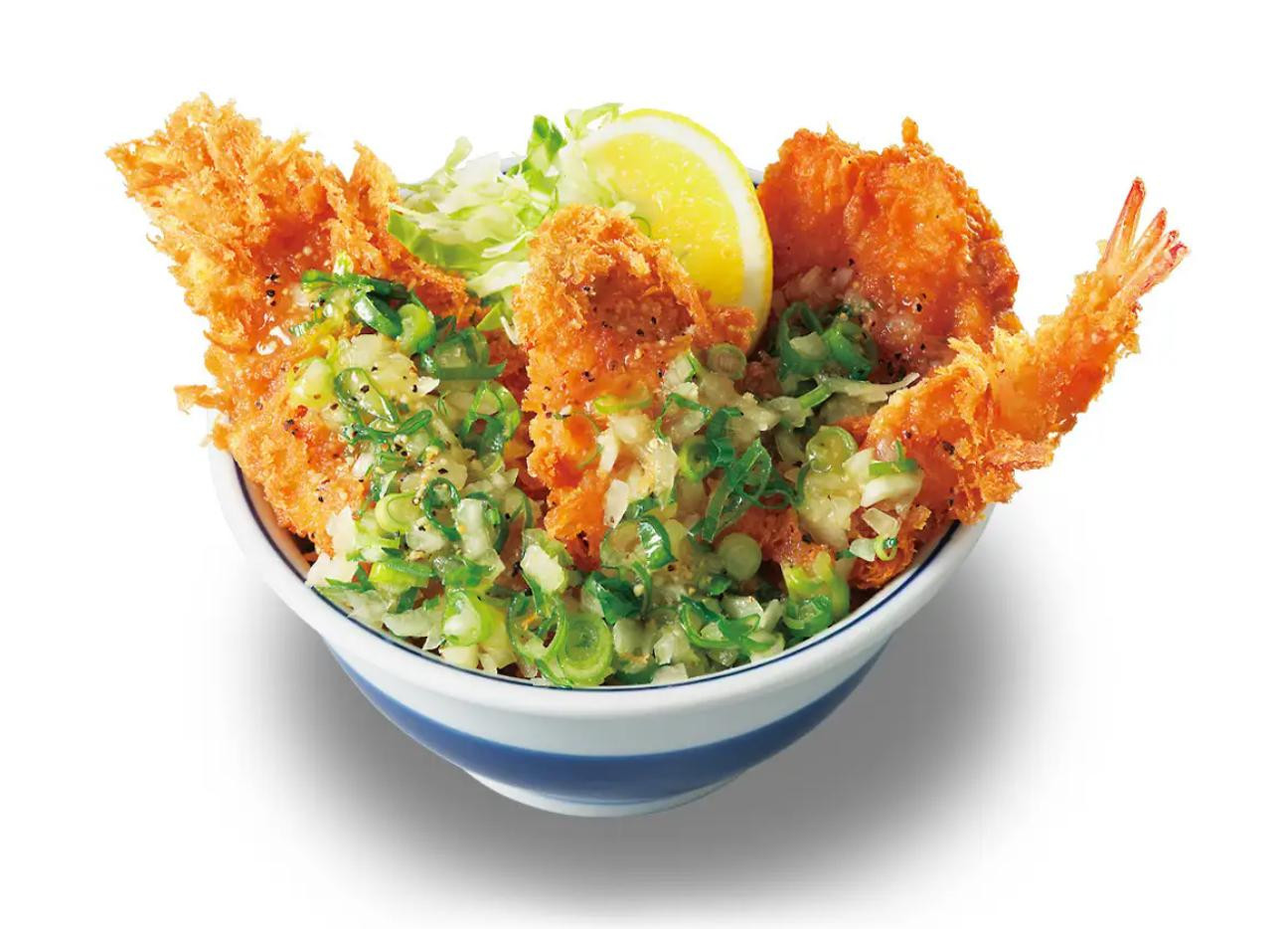 究極の生パン粉で仕上げた鶏ささみ・鮭フライ・海老フライと、特製から揚げ粉で仕上げた鶏のからあげを盛り付けた「ねぎ塩カツ丼」は、見た目にも迫力満点です。