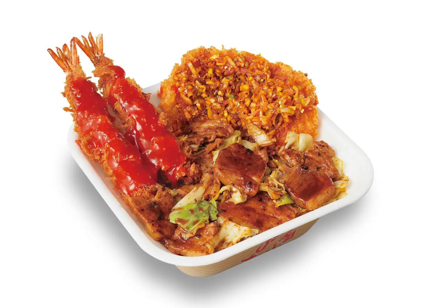 甘辛いタレが絡んだ厚切り肉の回鍋肉とチキンカツに甘酸っぱいネギダレをかけた油淋鶏、海老チリソースをかけた海老フライをひとつの丼に盛り付けました。