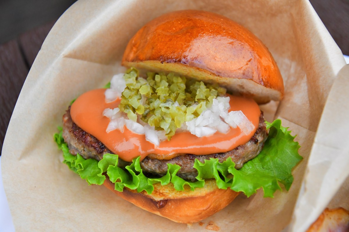 大自然の草原と山々、そして奥には壮大な富士山が見えるとあって、観光客にも地元にも人気のグルメスポット。メニューのウリは9種のハンバーガー。