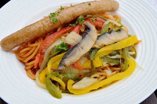ジャージーバターで痛めた野菜と肉汁たっぷりのソーセージが美味しいナポリタン♪