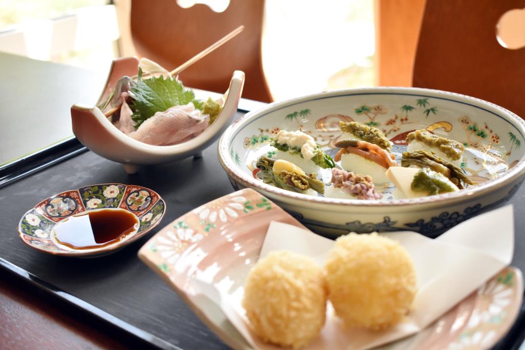 店主自ら八ヶ岳で採取した季節の山菜や天然きのこのお料理、その他四季を味わえる美しいお料理が種類豊富に用意されている留羽。