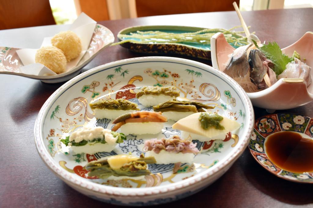 ●活魚水槽のお刺身もしくは寿司6ケ イワナ960円 マス700円(焼物・揚物も有ります) ●留羽名物山菜握り寿司 1,280円 ●岩魚・山菜御膳(いわな焼・山菜寿司・本日の天ぷら・ご飯・みそ汁・漬物)1,730円 ●百合根コロッケ(2ヶ)980円 ●ふきの干菓子 450円 ●コース( 前菜・吸物・焼物・揚物・お茶漬け・デザート等) ・3,240円~ ・4,320円~ ・5,000円~ ※コースは予約必須 |