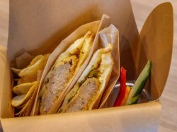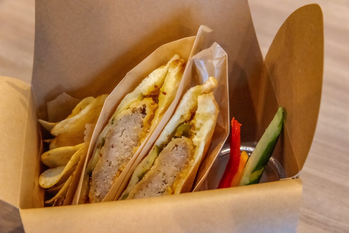こだわりの自家焙煎コーヒーをはじめ、富士桜ポークのメンチカツをサンドしたホットサンドや肉まんなどの軽食をテイクアウトできる。