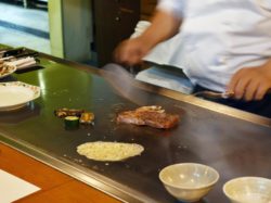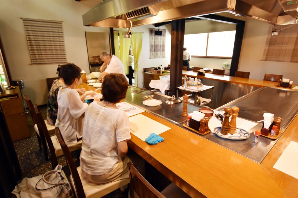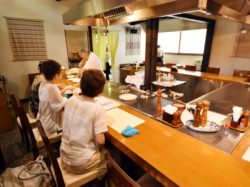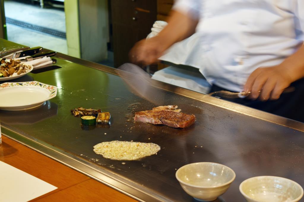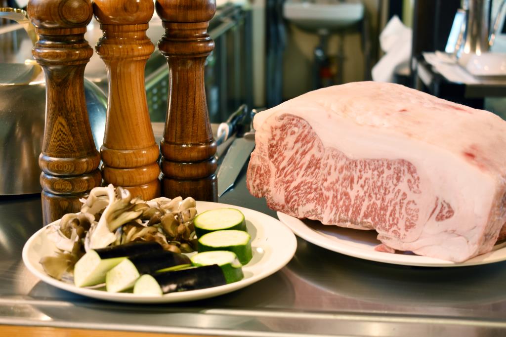 シェフこだわりの甲州産牛を目の前で焼き上げてもらうことができる。
