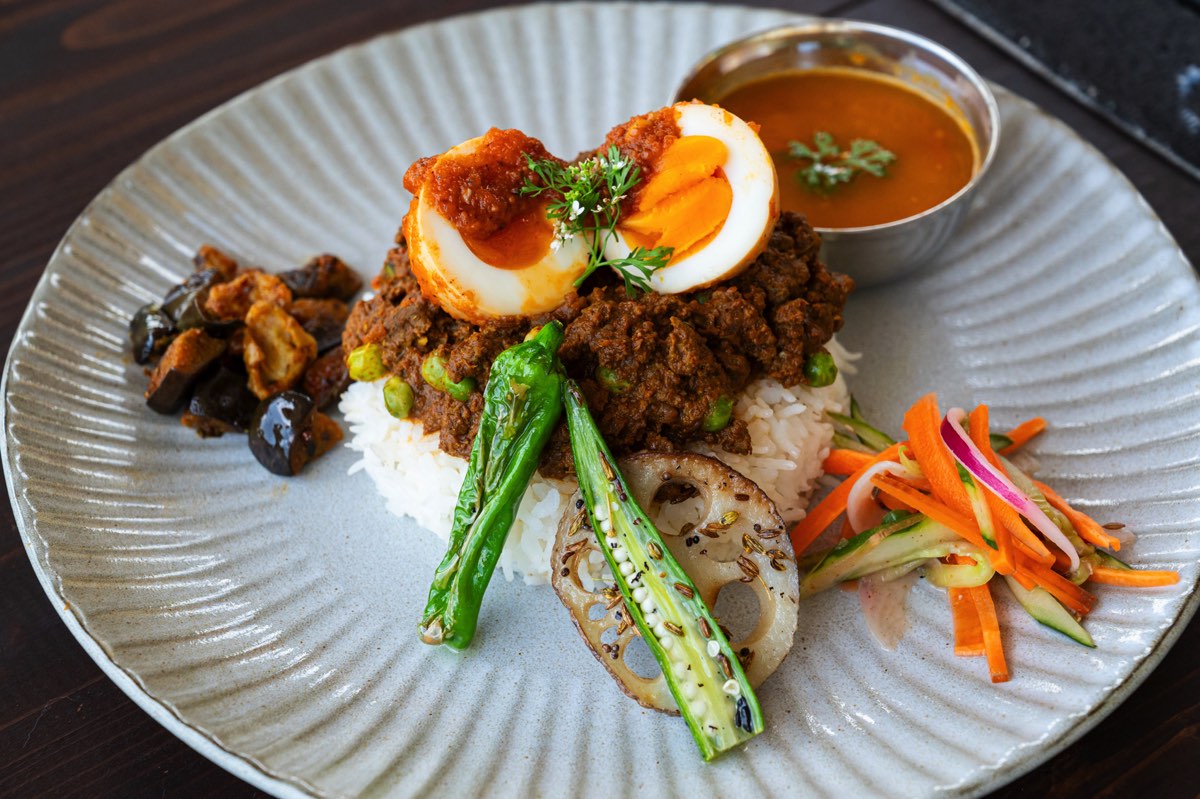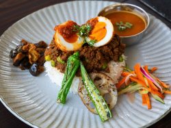 鹿肉キーマをはじめとした種類豊富なスパイスカリーは、仕込みやスパイスの配合などひとつひとつこだわったまた食べたくなる味わい。自家採れの季節野菜を使った副菜とともにどうぞ。