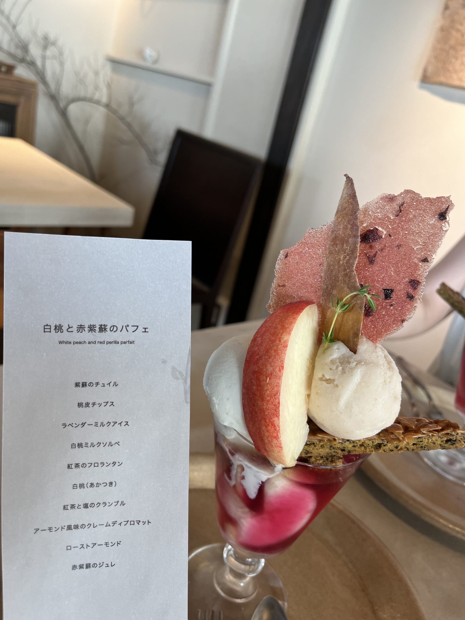 芸術品のように美しい桃と赤紫蘇のパフェを頂きました✨✨