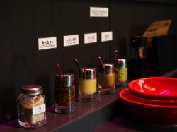 鉄板デミグラスをはじめ、自家製食べるタレや塩レモンのほか、カレーソルト・生わさびなど、5種類の薬味で味変も自由自在に。生ハラミステーキがついた豪華セットも。