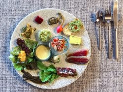 地元の旬な野菜や金沢から直送される魚など、新鮮な素材本来の味を活かした料理を味わうことができる。