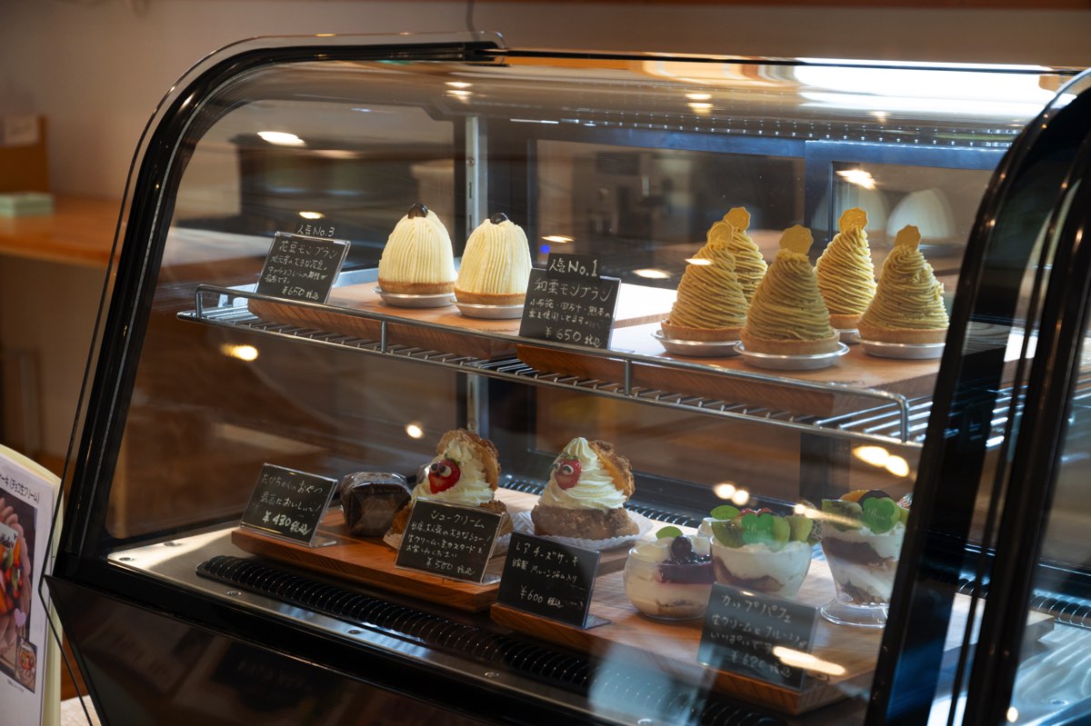苺に可愛い顔がついているこだわりの生クリームがたっぷり入ったシュークリームや自家製の小布施栗ジャムを使用したモンブラン、白い花豆モンブランなど、オリジナルケーキが大人気だ。