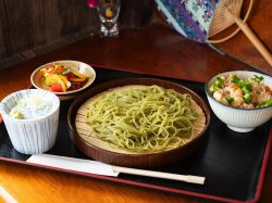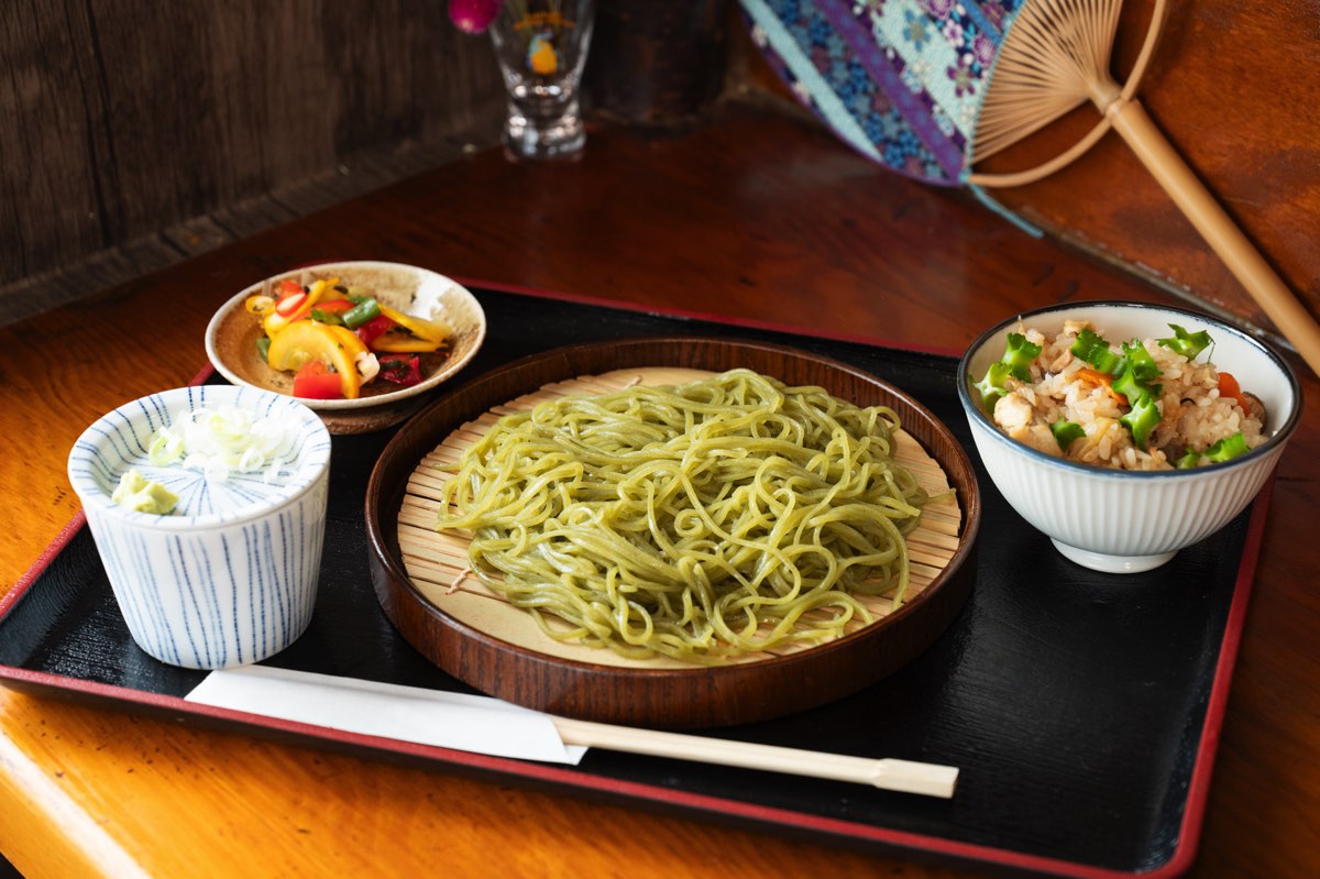 定番の「二八蕎麦」や、柚子切りや茶そばなど日替わりで楽しめる「本日の変わり蕎麦」のほか、旬の食材を使った炊き込みご飯や自家栽培した野菜の副菜小鉢が付くお得なセットも。