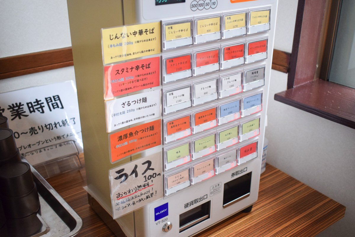 中華そばと辛そばは200g、つけ麺は250gと麺量が多めなので、少なめ希望の場合は食券を渡すときにひと声かけて。