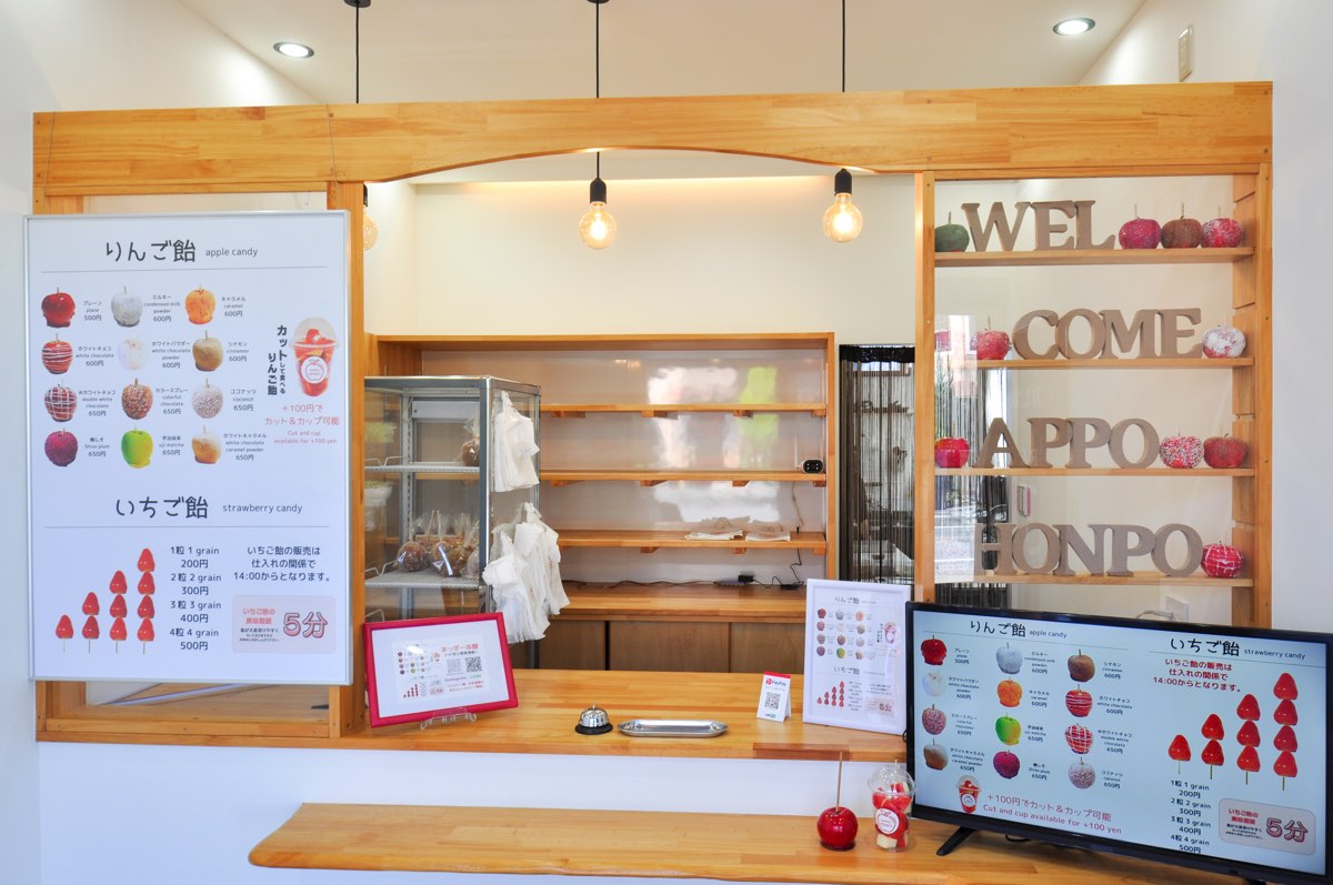 甲府市古上条町にあるりんご飴専門店「あっぽー本舗」。