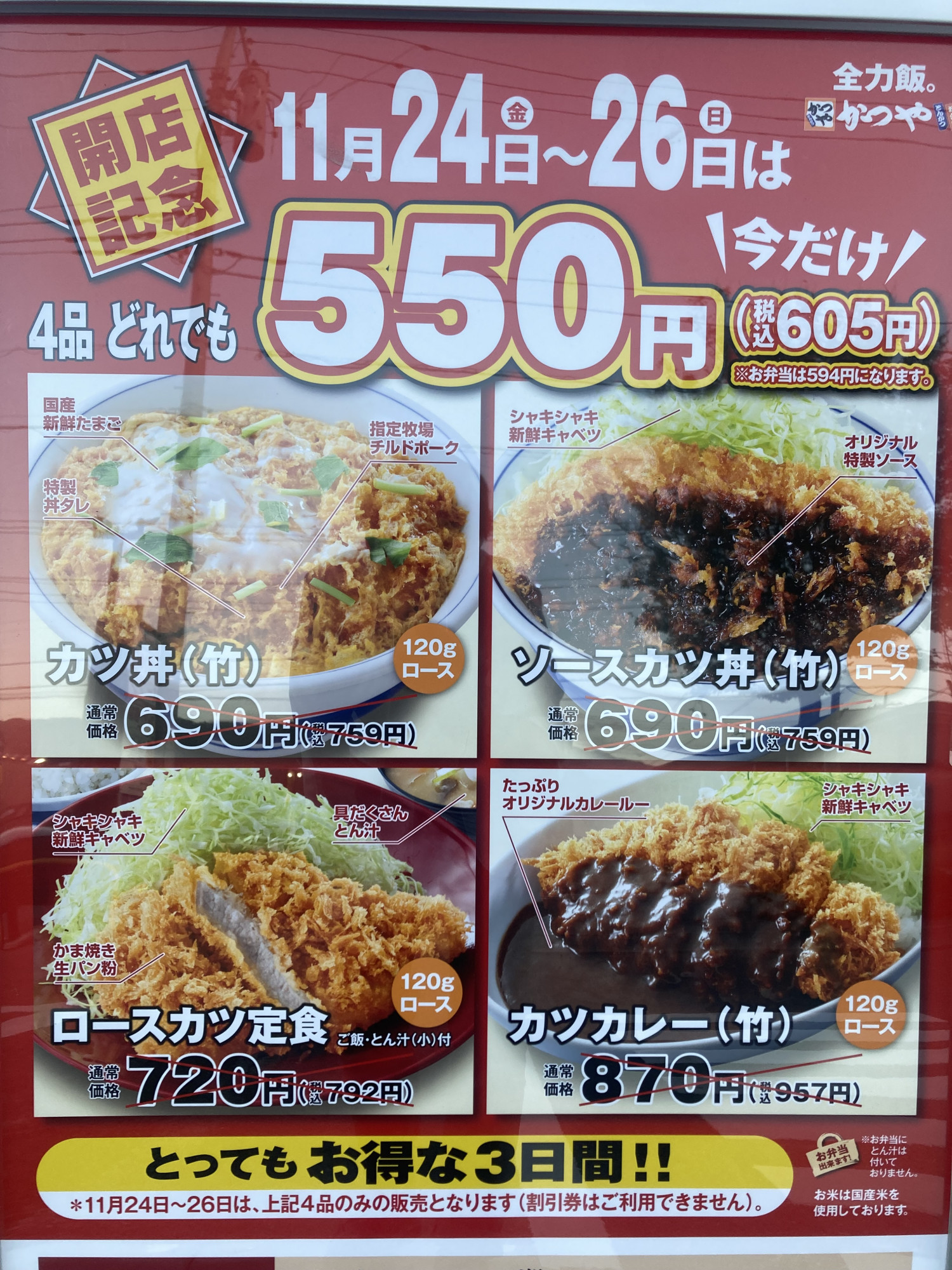 グランドオープン! ■カツ丼(竹)  通常税込759円が550円 ■ソースカツ丼(竹)  通常税込759円が550円 ■ロースカツ定食  通常税込792円が550円 ■カツカレー(竹) ...