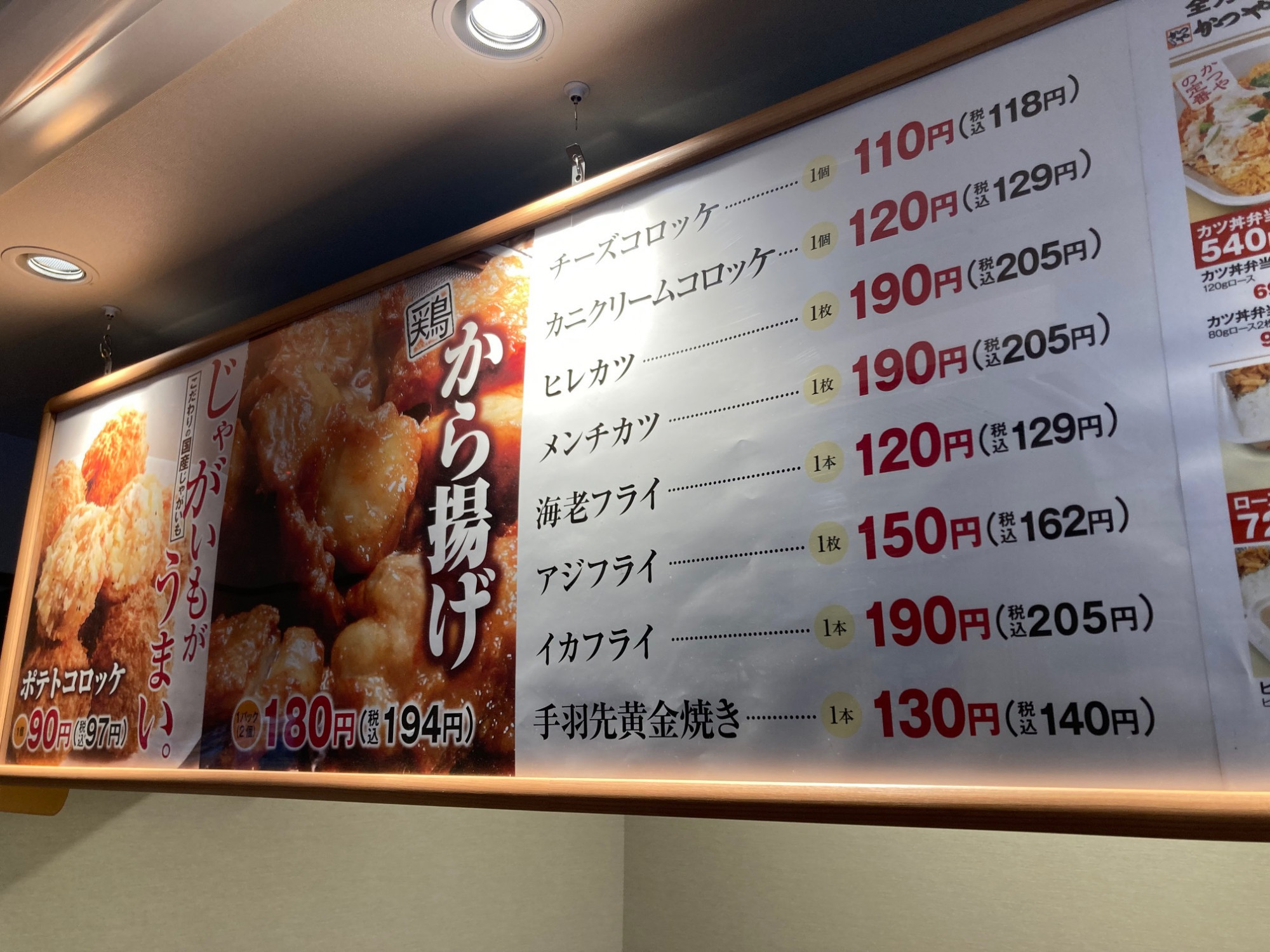 「かつ弁」メニューとは・・・店内で作りたての揚げ物をお弁当やお惣菜としてテイクアウトでき、手軽でお値打ちとお客様から好評です。 ■店内仕込みのポテトコロッケ(1個)/90円(税込97円) ■から揚...