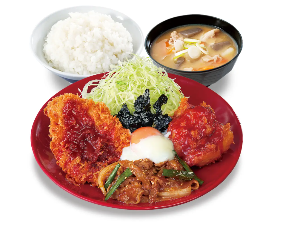 プルコギ、ヤンニョム風鶏唐揚げ、にロースカツ+ビビンバソースの盛りだくさんなおかずが楽しめる、定食スタイルの「牛豚鶏のプルコギビビンカツ定食」が登場! お好みで温玉トッピングが選べ、韓国のりが風... -