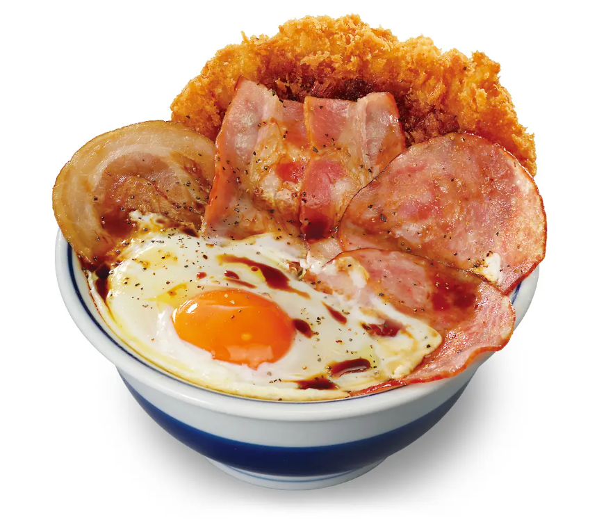 かつやではチャーシュー、ベーコン、ソーセージがのった丼を