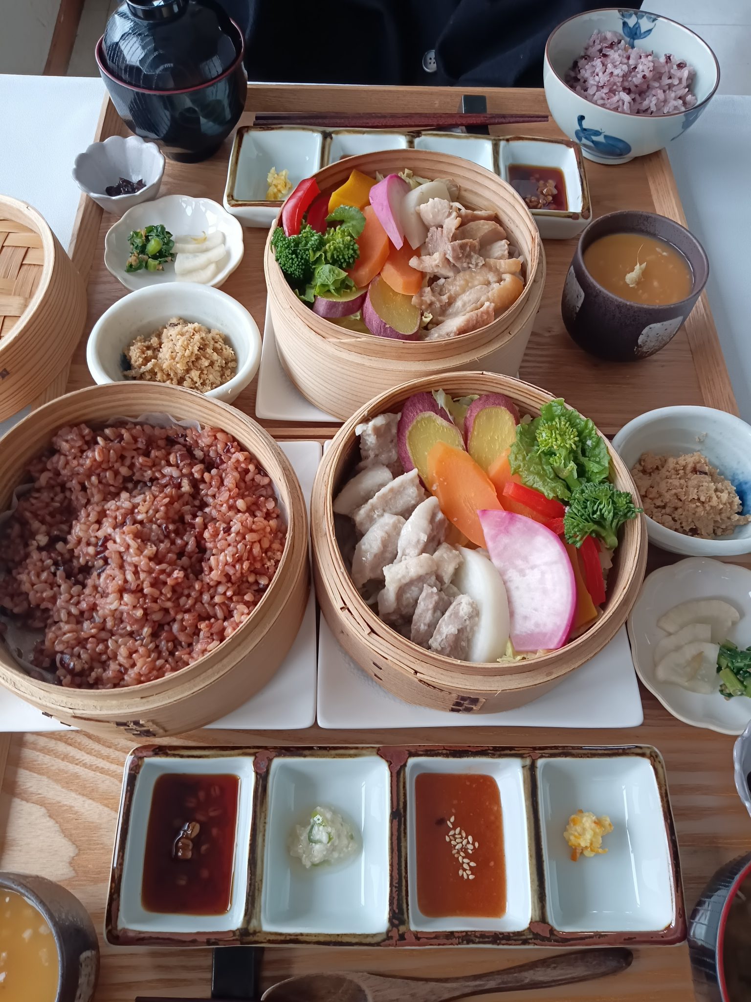 ・LUNCH MENU豚・鶏(白米or黒米・旬の野菜蒸し・汁物・茶碗蒸し・小鉢・漬物付き) 1,500円 ※ご飯大盛り+100円・発酵玄米+300円 ・発酵ちまき 600円 ・三種の自家製アイス(バニラ・ヨーグルト・酒粕) ミニ200円・レギュラー450円 ・黒にんにく糀 90g660円・150g1,100円 |