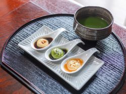 【ランチ】 ・もみじセット 3,000円(手毬ずし13貫・天ぷら3種・茶碗蒸し・お吸い物・最中) ・あじさいセット 2,200円(手毬ずし13貫・おばんざい・お吸い物・最中) ・さくらセット 1,500円(手毬ずし8貫・おばんざい・お吸い物・最中) 【ディナー】 ・手毬ずし 980円(8貫) ・季節の天婦羅3種盛り 800円 ・季節のおばんざい2種盛り 500円 【デザート】※ほうじ茶or緑茶or抹茶付き ・3種の団子 650円 ・なめらかプリン 500円 |
