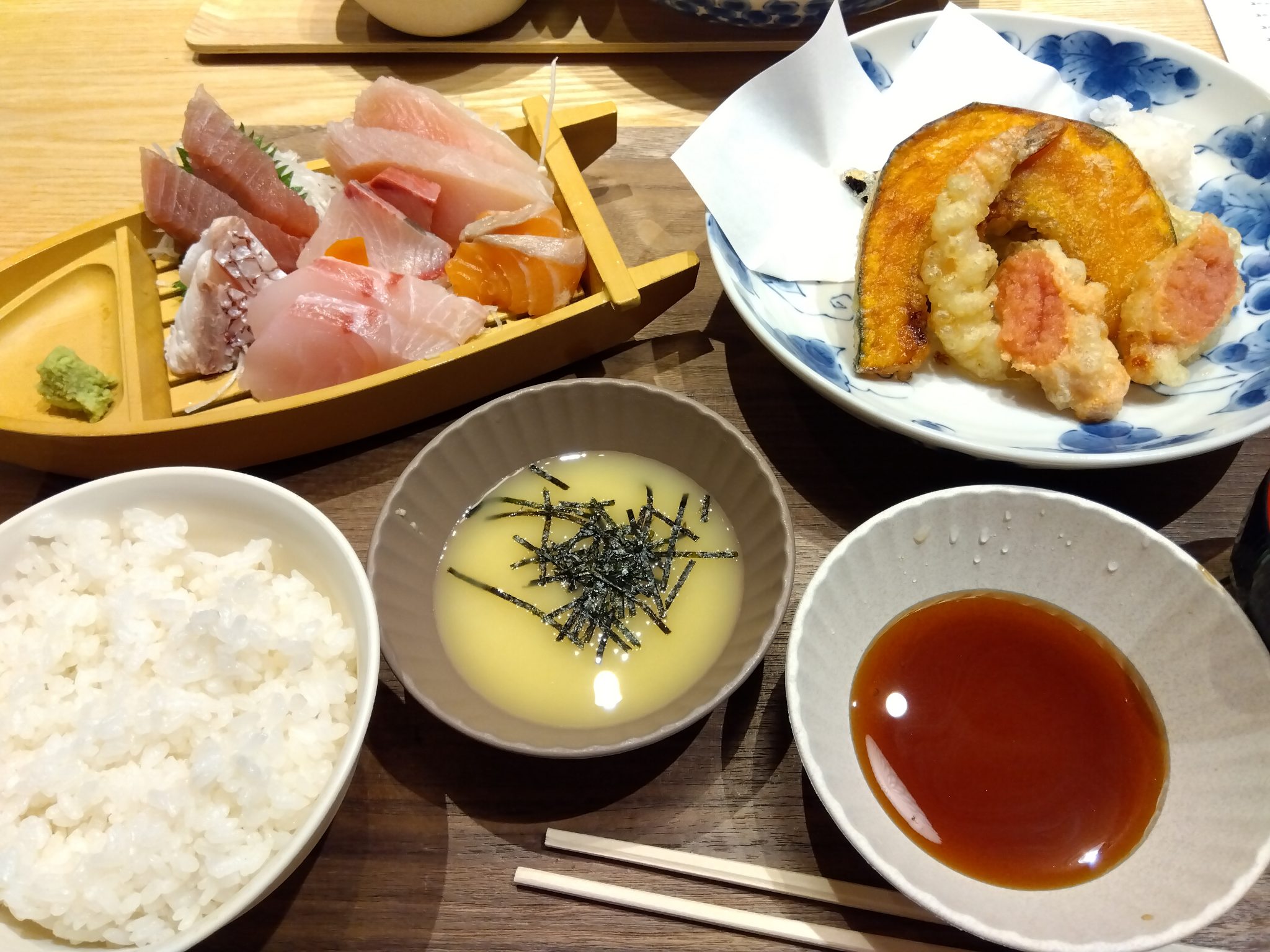 昼も夜も営業していますが、夜に来店。昼、夜共に定食メニューがある所が良かったです。「春夏秋冬定食」は、種類豊富な刺し身に天麩羅が付いて、色々楽しめます。明太子の天麩羅が珍しかったです。店内は清潔感があり良かったですが、味は普通でした。